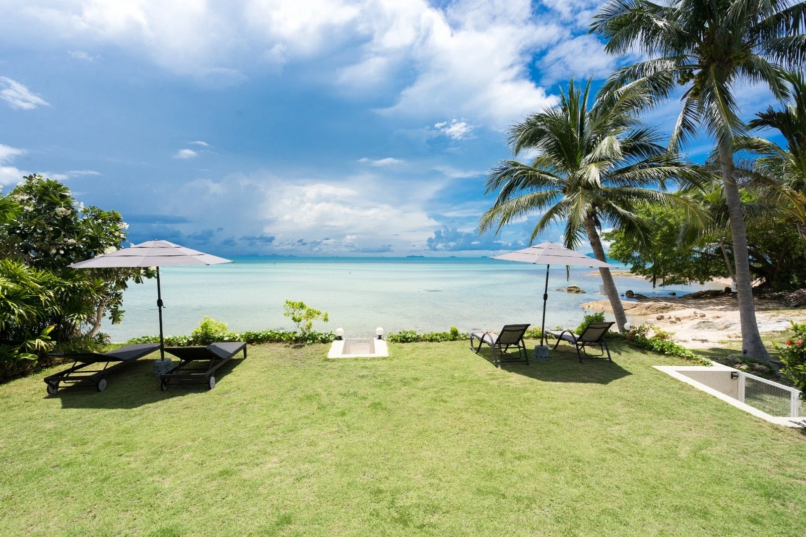 This villa is located directly on the beach with a beautiful garden and private pool, facing west with breathtaking sunset views, along a charming little beach. It offers four bedrooms: two with sea views, one overlooking a small tropical garden, and one ideally accommodating up to four children (two bunk beds). All bedrooms have en-suite bathrooms. There is a large open-plan living, dining, and kitchen area with views of the sea and pool.