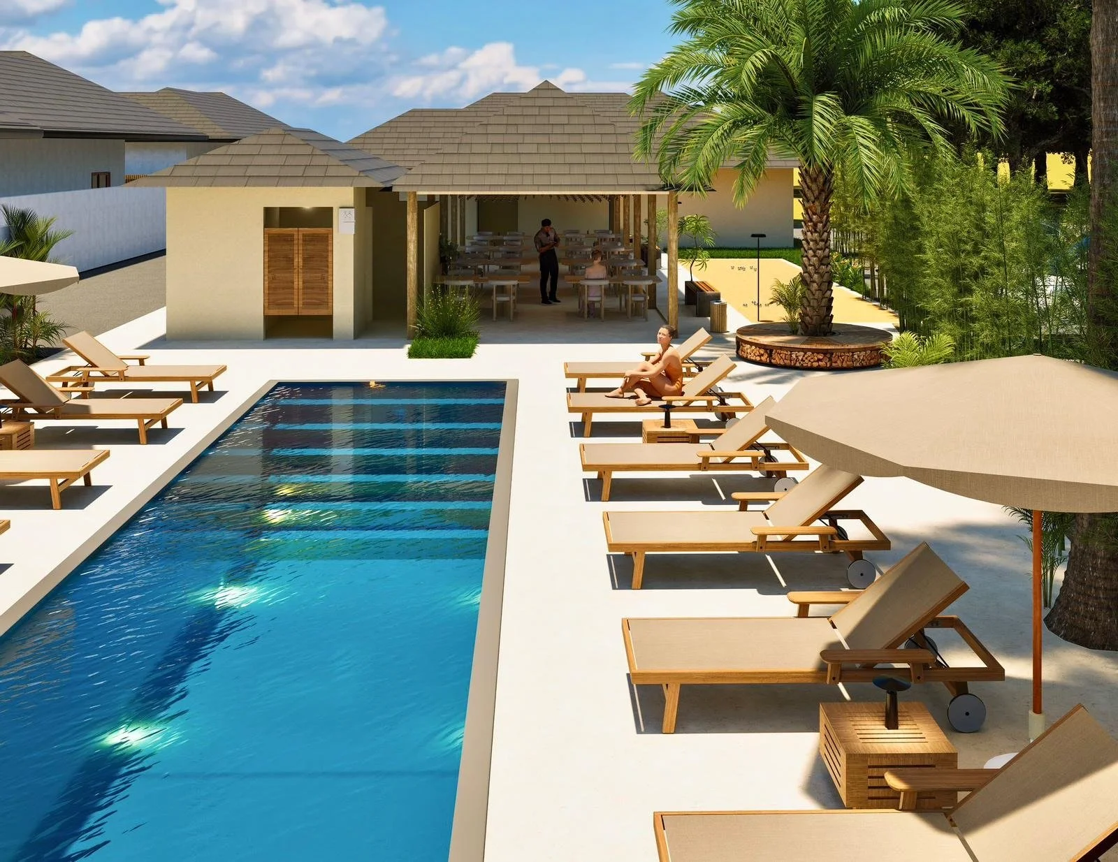 Where sophistication meets island lifestyle, this spacious 3-bedroom villa offers the perfect blend of modern architecture and serene natural surroundings. The bright open-plan living area (40 m²) with a fully equipped kitchen invites seamless indoor-outdoor living, complemented by large sliding glass doors that open to a landscaped private garden and swimming pool.