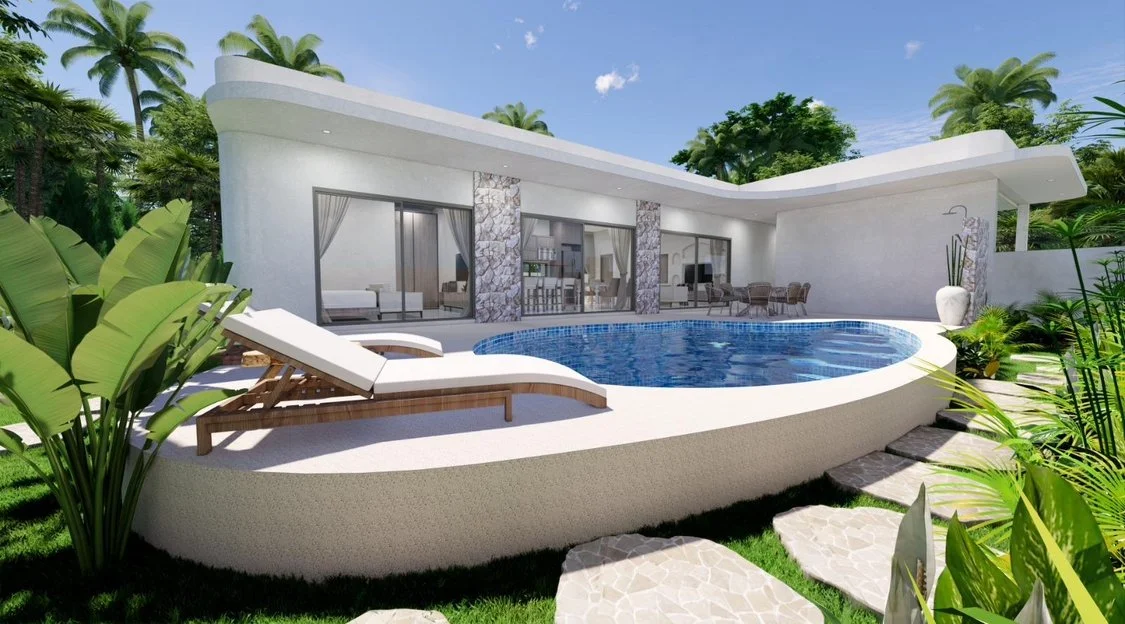 Stylish 3-bed, 4-bath sea view villa in Choeng Mon with unique tear drop pool, curved architecture, and leasehold ownership. Exclusive furniture package available until July 1.